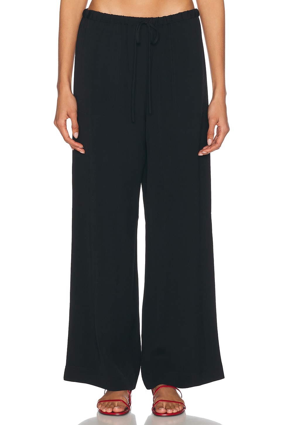 Details - 96% viscose, 4% linen - Hand wash - Elasticized waistband with drawstring closure - 4-pocket design - Textured crepe fabric - Made in China - Our Style No. TOTF-WP66 - Manufacturer Style No. 252-WRB1709-FB0192