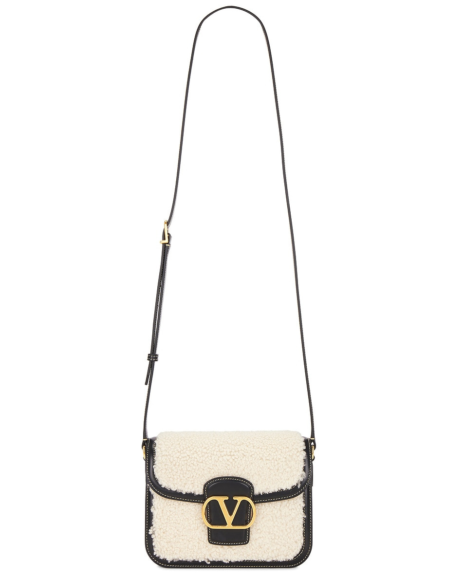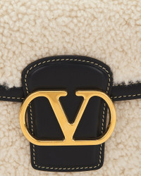 Details - Sherpa exterior with leather lining - Flap top with magnetic button closure and gold-tone Valentino hardware at front - Three compartments - Interior slip pocket with snap button closure - Leather adjustable shoulder strap - Measures approx 24 cm W x 19 cm H x 8 cm D - Shoulder strap with a 33 cm-48 cm drop - Made in Italy - Our Style No. VENT-WY1279 - Manufacturer Style No. 7W2B0R46QVM