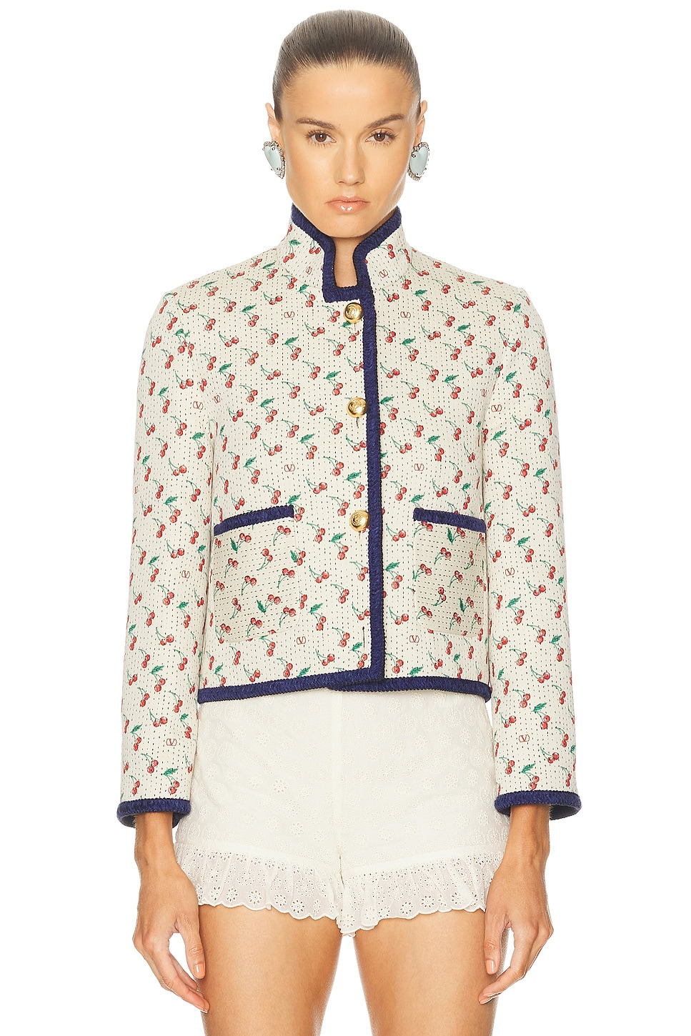 Details - Self: 85% cotton, 15% polyester - Lining: 100% viscose - Dry clean only - Front gold-tone button closure - Front slip pockets - Velour trim - Cropped fit - Heavyweight canvas fabric - Made in Italy - Our Style No. VTIF-WO36 - Manufacturer Style No. 7B3CJ3Q79LG