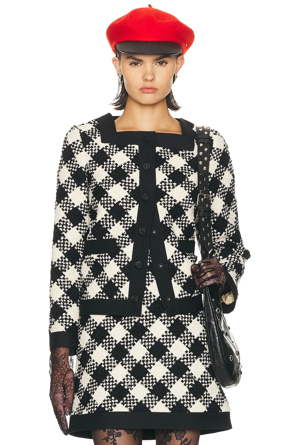 Details - Self: 44% Cotton, 18% Wool, 16% Viscose, 12% Acrylic, 8% Polyamide, 2% Mohair Wool - Lining: 100% Silk - Made in Italy - Dry clean only - Front closure with beaded boule buttons - Damier tweed with habotai lining and crepe couture trim - Item not sold as a set - Our Style No. VTIF-WO43 - Manufacturer Style No. 8B3CE5359WK