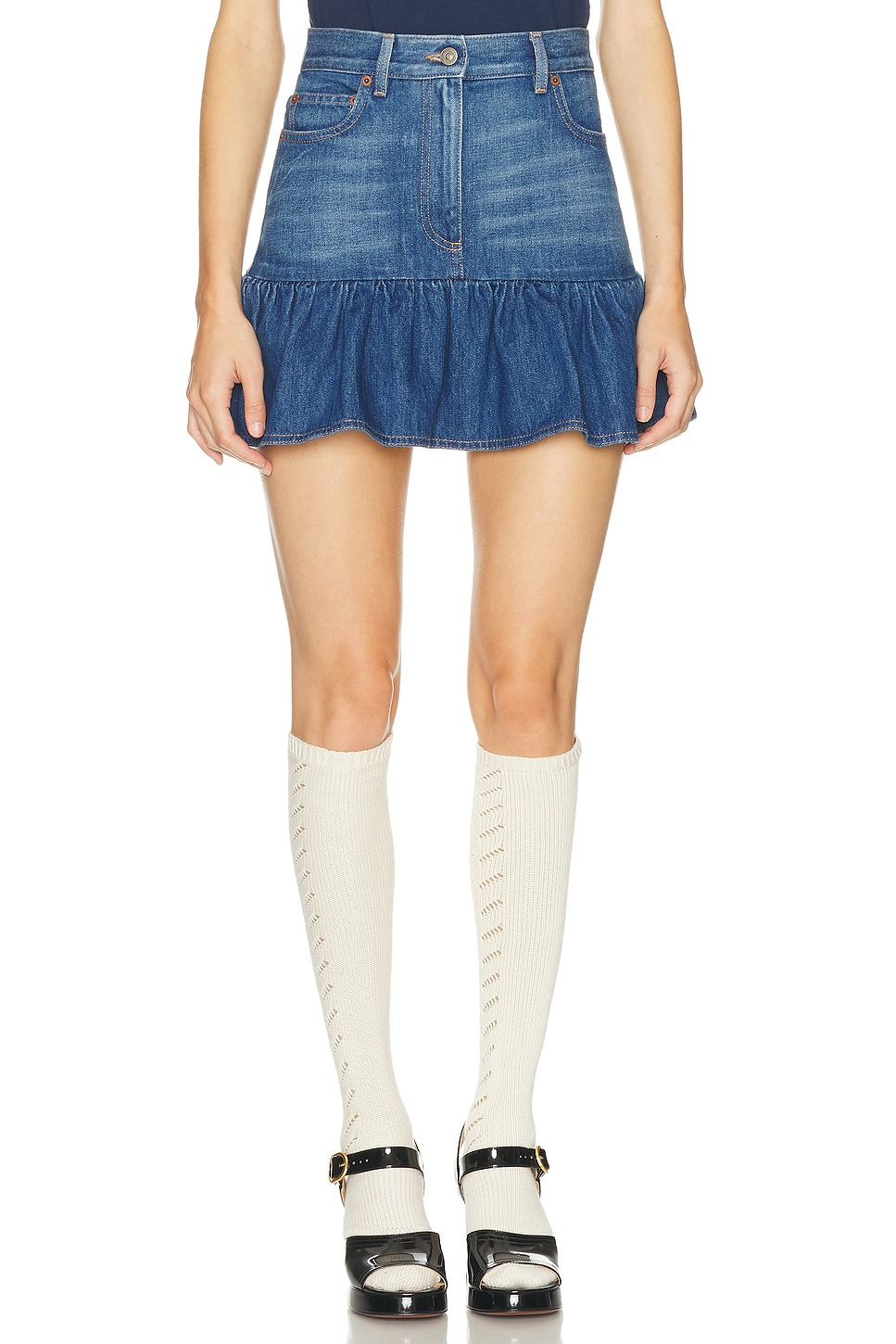 Details - Self 1: 100% cotton - Self 2: 100% calfskin - Pocket Lining: 65% polyester, 35% cotton - Hand wash - Unlined - Zip fly with button closure - Logo patch at back waist - Light intentional whiskering detail - Denim fabric with ruffle detail - Made in Italy - Our Style No. VTIF-WQ38 - Manufacturer Style No. 7B3DD20L9KH