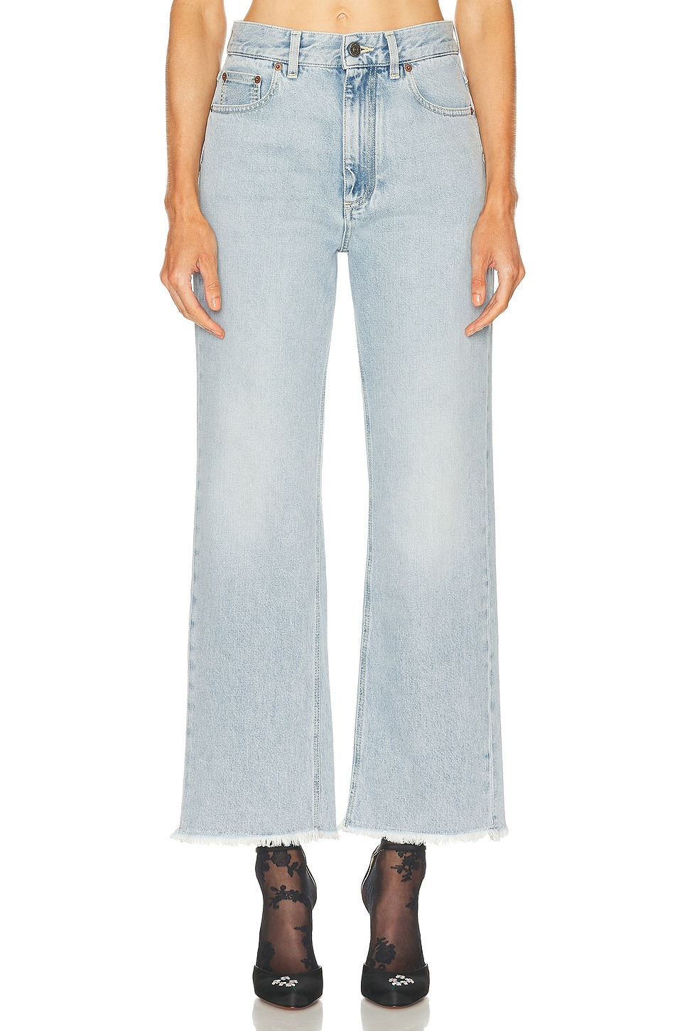 Details - Self: 100% cotton - Lining: 69% polyester, 31% cotton - Contrast Fabric: 100% calf leather - Hand wash - Zip fly with button closure - 5-pocket design - Intentional fading and light whiskering - Back leather logo patch - Heavyweight denim fabric with fringed hem - Made in Italy - Our Style No. VTIF-WJ7 - Manufacturer Style No. 7B3DD19O94W