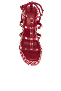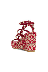 Details - Calfskin leather upper with rubber sole - Gold-tone ankle buckle closure - Cushioned leather footbed - Jute midsole with woven detailing - Signature pyramid rockstuds - Rounded toe - Approx 95mm/ 3.8 inch wedge - Approx 25mm/ 1 inch platform - Made in Spain - Our Style No. VENT-WZ966 - Manufacturer Style No. 7W2S0F95VNQ