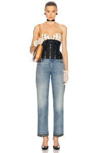 Details - Self 1: 100% cotton - Self 2: 100% calf leather - Pocket Lining: 65% polyester, 35% cotton - Made in Italy - Hand wash - Zip fly with button closure - 5-pocket design - Leather logo patch at back waist - Intentional whiskering and fading detail - Denim fabric with floral fabric detail at trim - Our Style No. VTIF-WJ6 - Manufacturer Style No. 6B0DD19X94V