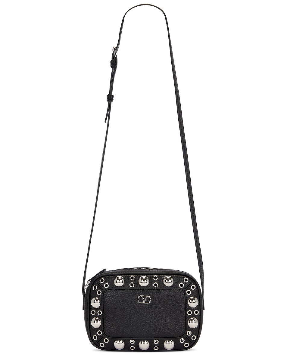 Details - Grained calf leather exterior adorned with ball studs and rivets and suede leather lining - Top zipper closure - One main compartment - 2 interior slip pockets - Adjustable leather crossbody strap - Measures approx 23 cm W x 16 cm H x 6 cm D - Crossbody strap with a 55 cm drop - Made in Italy - Our Style No. VENT-MY82 - Manufacturer Style No. 7Y2B0R74MJL
