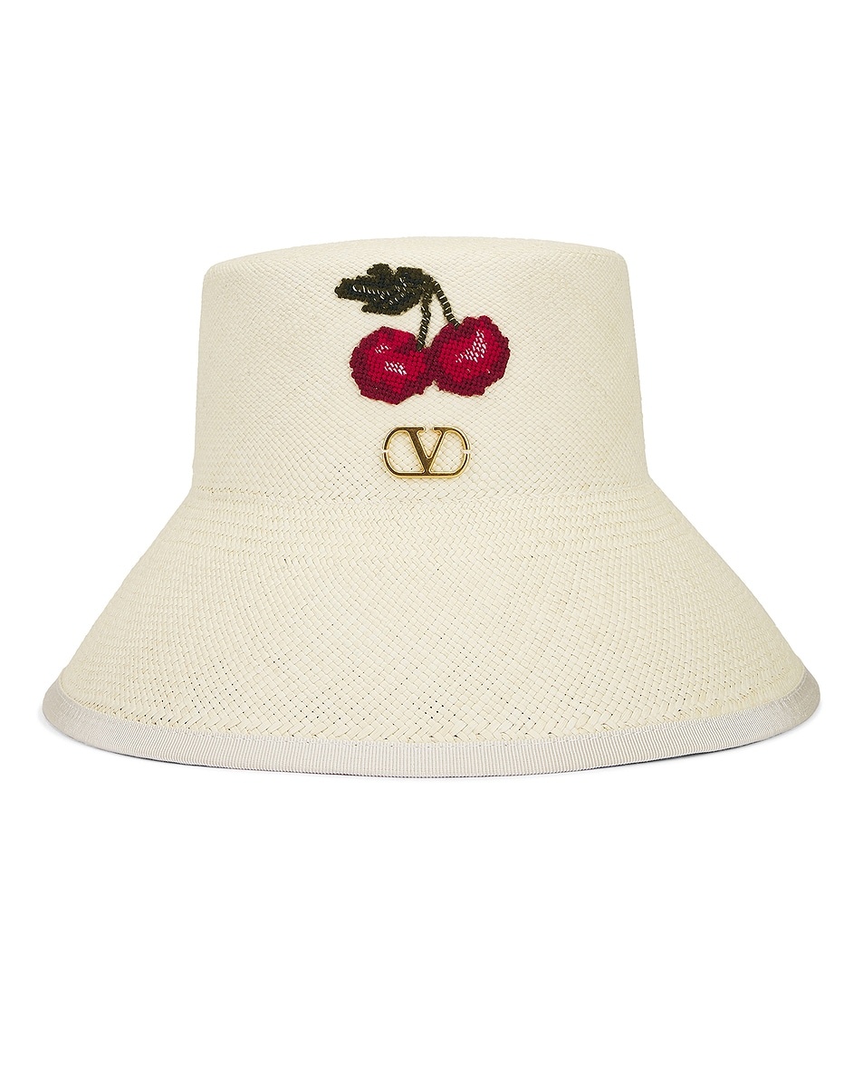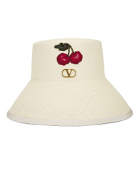 VLOGO SIGNATURE STRAW BUCKET HAT WITH LEATHER TRIM AND CHERRYFIC EMBROIDERY