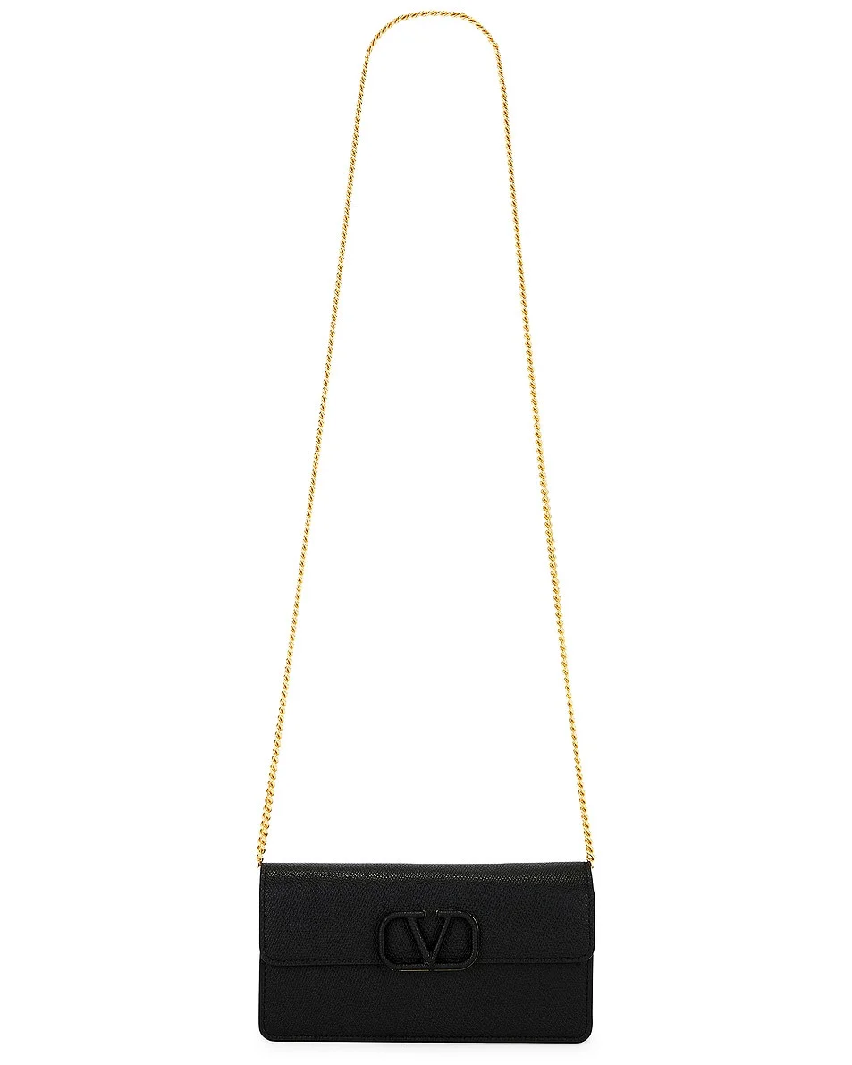 Details - Grain calfskin leather exterior with smooth leather lining - Flap top with magnetic button closure and tonal VLogo hardware at front - One main compartment - 6 interior card slots and single bill compartment - Interior zipper pocket - Detachable gold-tone chain shoulder strap - Measures approx 20 cm W x 10 cm H x 5 cm D - Made in Italy - Our Style No. VENT-WY1297 - Manufacturer Style No. 7W0P0S93RQR