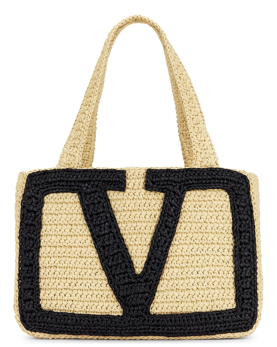 Details - Raffia exterior and lining - Open top - One main compartment - Contrast Valentino logo at front - Dual shoulder straps - Measures approx 13.5" W x 9" H x 3.75" D - Shoulder strap with a 11.5" drop - This item is not available to ship to Australia - Made in Italy - Our Style No. VENT-WY1267 - Manufacturer Style No. 7W2B0S11QET