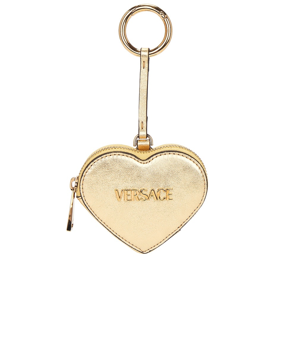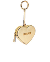Details - Lambskin leather exterior and lining with gold-tone hardware - Top zip closure - One main compartment - Front Versace Logo lettering - Attached keyring with spring ring closure - Please note, bag is not included - Measures approx 10 cm W x 8 cm H x 3 cm D - Strap measures approx 10 cm in length - Made in Italy - Our Style No. VSAC-WY226 - Manufacturer Style No. 1019350_1A15180
