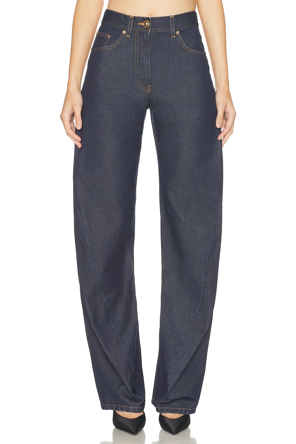 Details - Self: 100% cotton - Contrast Fabric: 100% calf leather - Machine wash - Zip fly with gold-tone button closure - 5-pocket design - Contrast stitching detailing - Back leather logo patch - Heavyweight denim fabric - Item not sold as a set - Made in Italy - Our Style No. VSAC-WJ17 - Manufacturer Style No. 1020882_1A15341