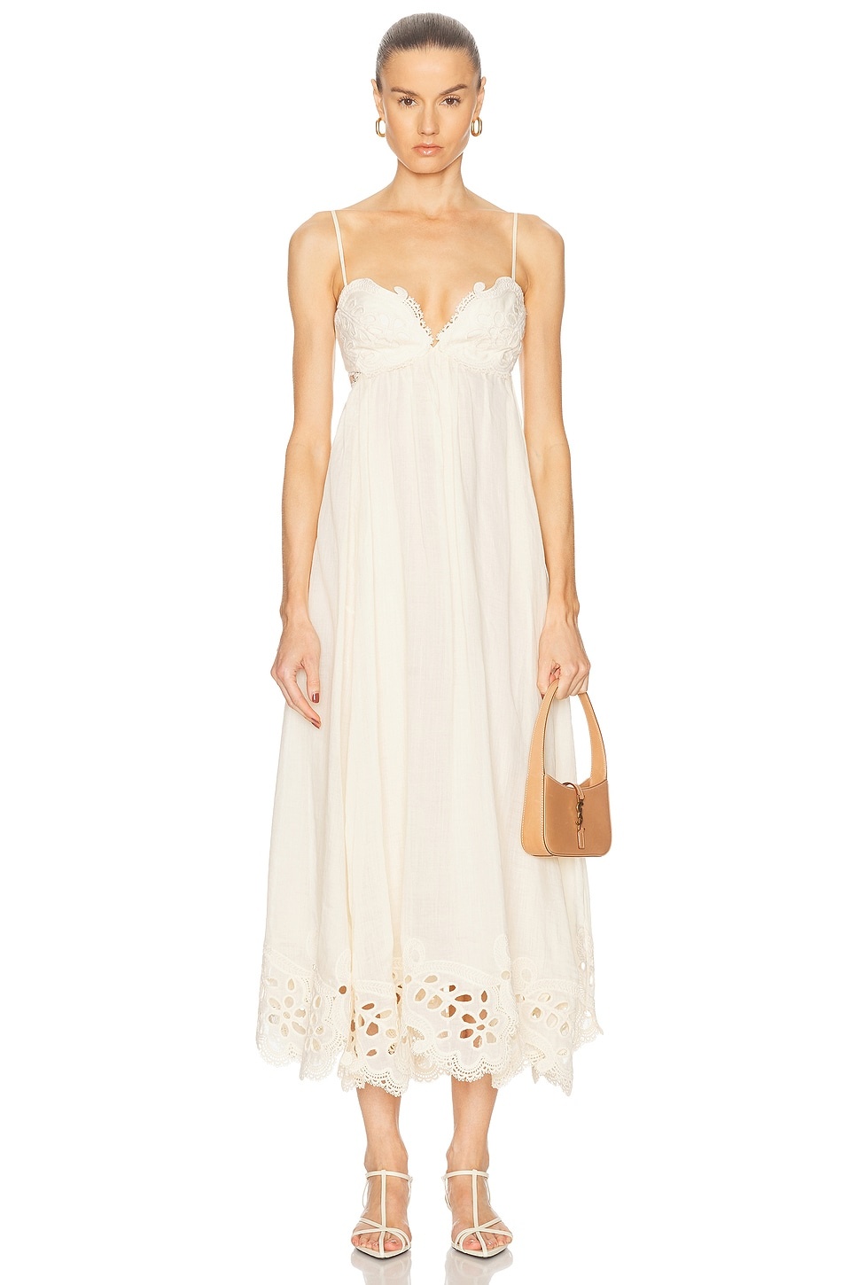 Details - Self 1: 100% ramie - Self 2 & Lining: 100% linen - Self 3: 100% polyester - Dry clean only - Fully lined - Back hook and eye clasp closure - Hidden back zipper closure - Adjustable shoulder straps - Cut-out detail at back - Linen fabric with eyelet detail - Made in China - Our Style No. ZMER-WD774 - Manufacturer Style No. 2929DSS254