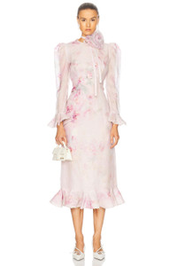 Details - Self: 55% linen, 45% silk - Lining: 100% cotton - Made in China - Dry clean only - Partially lined - Hidden back zipper closure - Optional floral pin accessory included - Puffy-sleeve design - Linen fabric with faux pearl detail at trim - Our Style No. ZMER-WD723 - Manufacturer Style No. 2337DR251