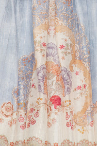 Details - Self & Bodice Lining: 72% cotton, 25% silk, 3% metallized fiber - Skirt Lining: 100% cotton - Made in China - Dry clean only - Fully lined - Hidden back zip with hook and eye closure - Lightweight chiffon fabric with metallic gold threading - Tiered ruffled skirt with tucked waist - Our Style No. ZMER-WD818 - Manufacturer Style No. 5353DRS263