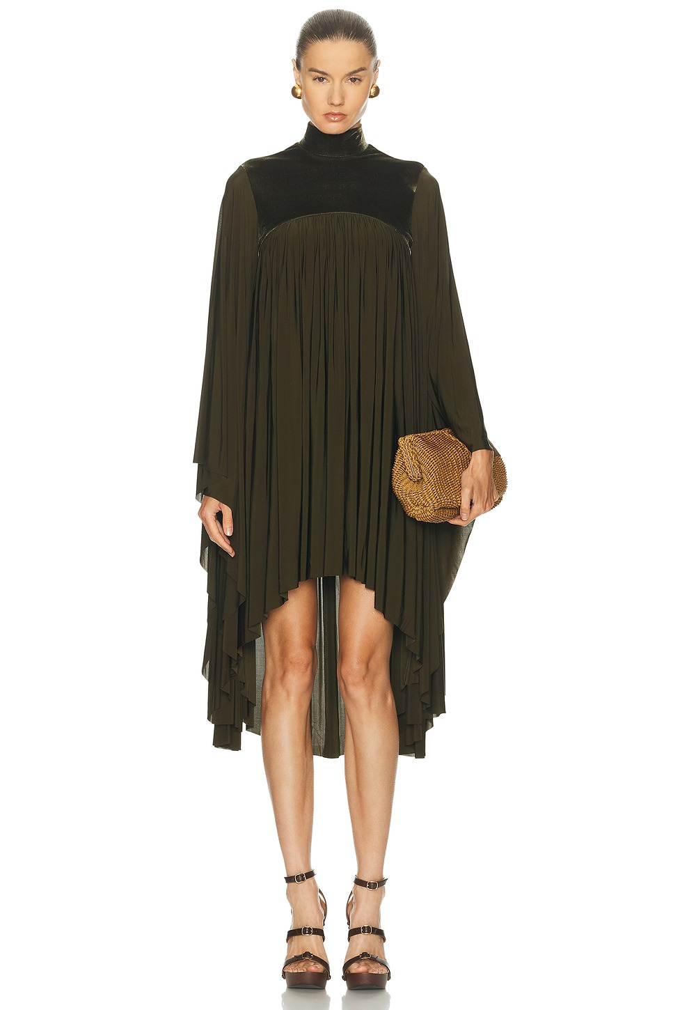 Details - Self 1: 90% viscose, 10% elastane - Self 2: 95% polyester, 5% elastane - Dry clean only - Partially lined - Hidden back zipper closure - Mockneck styling - Asymmetrical hem design - Slinky jersey fabric with velvet fabric at top - Made in China - Our Style No. ZMER-WD798 - Manufacturer Style No. 5563DF252