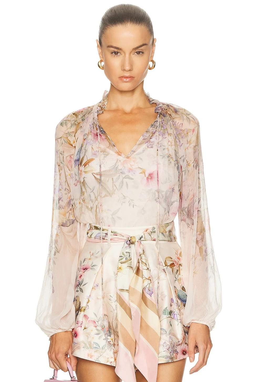 Details - 86% polyester, 14% elastane - Made in China - Hand wash or dry clean only - Pull-on styling - V neck - Ruffled trim around collar - Bubble sleeves - Internal camisole with adjustable straps - Our Style No. ZMER-WS471 - Manufacturer Style No. 0991TC261