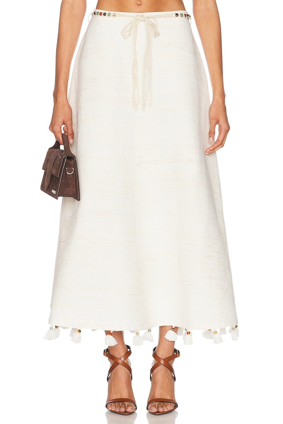 Details - Self: 54% cotton, 24% viscose, 19% tasar silk, 3% other fiber - Lining: 100% cotton - Dry clean only - Partially lined - Hidden back zipper closure - Self tie-up with beaded accent at waist - Linen fabric with fringe detail at hem - Item not sold as a set - Made in China - Our Style No. ZMER-WQ127 - Manufacturer Style No. 3584SSS251