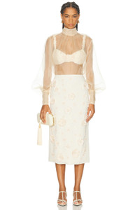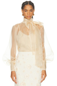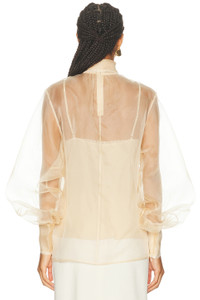 Details - Self 1: 100% silk - Self 2: 100% polyamide - Dry clean only - Hidden back zipper closure and tie-up accent at collar - Optional camisole included - Zipper cuff closure - Sheer organza fabric - Made in China - Our Style No. ZMER-WS459 - Manufacturer Style No. 5353TF252