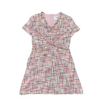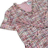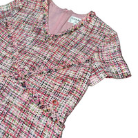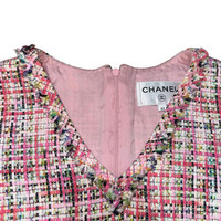 A Chanel Pink Tweed V-Neck Fringed Dress. Condition: This dress has been worn and remains in very good condition. Minor wear to tweed in places. Designer - Chanel Colour - Pink Material - Tweed Style - V-Neck Fringed Size -FR 40 Year - 2017 Content: 54% Cotton 32% Nylon 14% Viscose Condition: 8.5/10 due to usage but has no visible flaw Shipping through DHL Express ETA: 3-7 working days