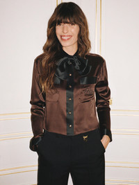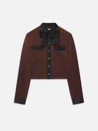 Crafted from 100% silk in rich chocolate brown, this FRAME x Ritz Paris blouse features contrast satin detailing, branded “Ritz Paris” buttons, and embroidery at the wearer’s left chest pocket. Finished with a detachable bow at the neckline, it’s a polished statement piece that captures the elegance of the iconic hotel. DETAILS - Dry Clean Only - 100% Silk - 21" Long From Shoulder - WP26WBL021-CHBR