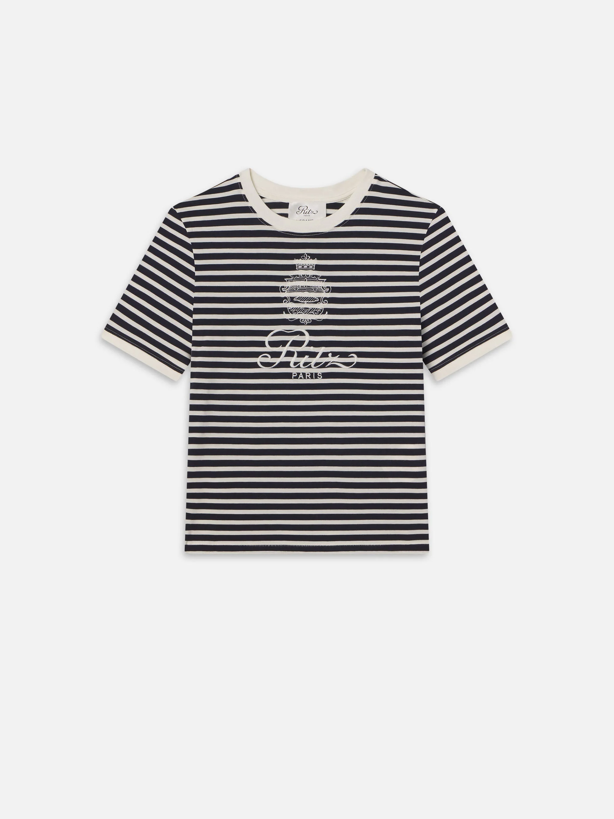 The bestselling baby tee has an ultra Parisienne feel thanks to classic stripes and the Ritz Paris crest. Crafted in indulgently soft Supima cotton, this piece joins your go-to, everyday T-shirt rotation. The slightly shrunken fit pairs with denim for a chic, fuss-free uniform. Materials & Care Machine Wash Cold 100% Pima Cotton 21.25" Long From Shoulder WP25JTE006-NAMU