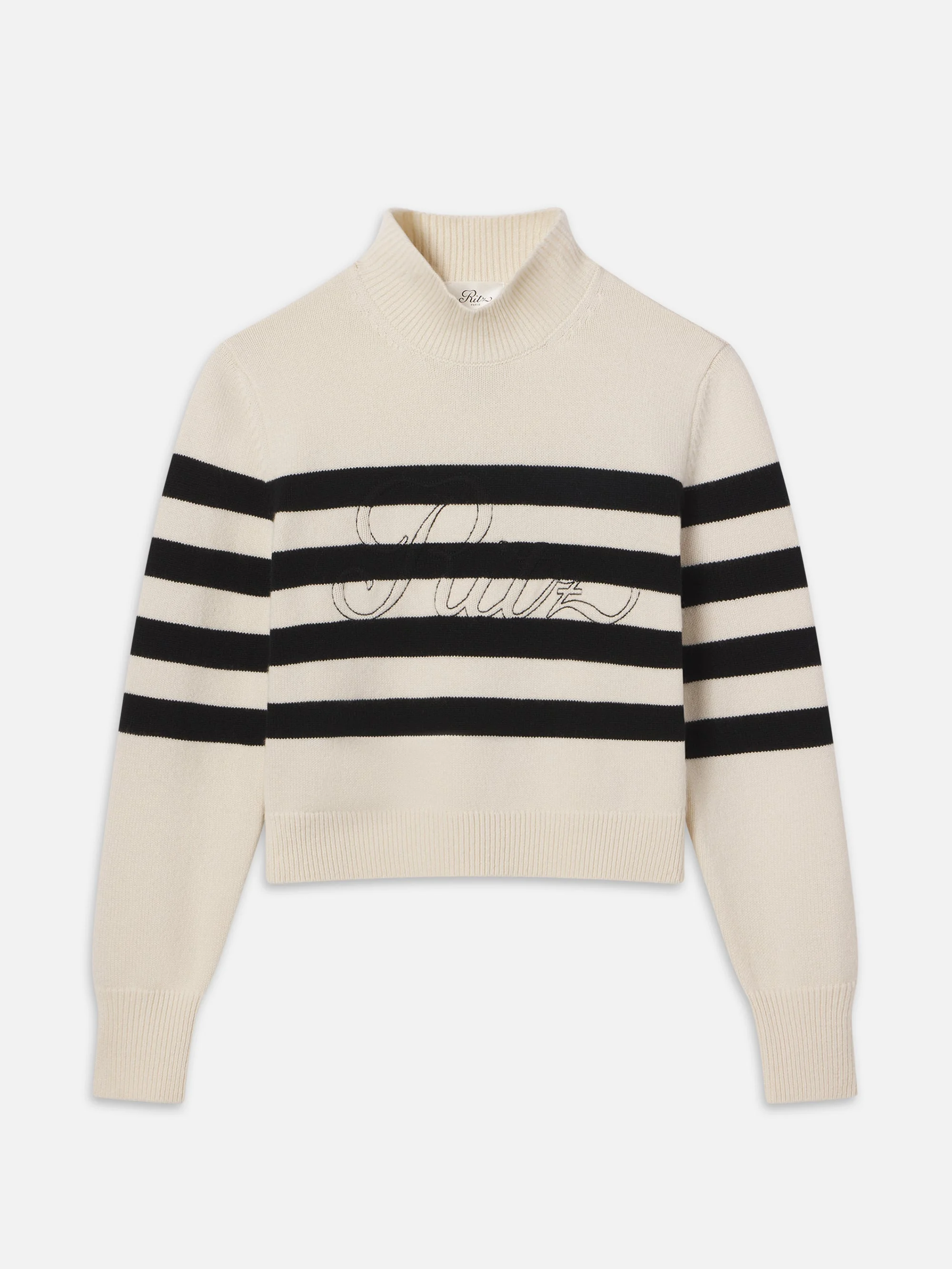 Expertly knit from luxurious Italian cashmere, this FRAME x Ritz Paris striped turtleneck blends timeless appeal with a modern point of view. The logo detail provides a quietly elevated finish. DETAILS - Dry Clean Only - 100% Woolen Cashmere - 20.125" Long From Shoulder - WP26KSW044-CREM
