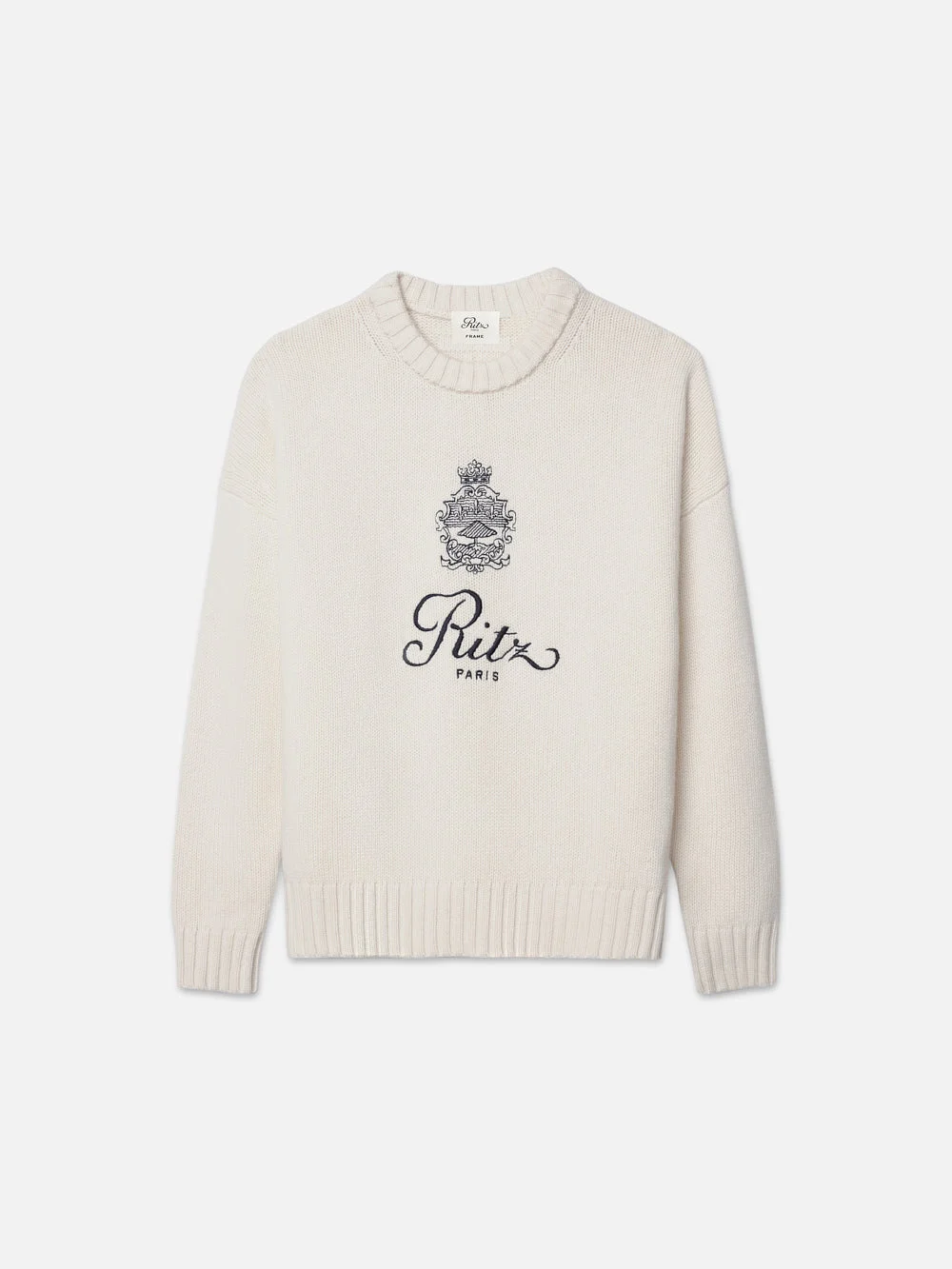 A luxuriously soft 100% cashmere knit done in classic crewneck style with extra attention to detail: ribbed cuffs and hem, an exaggerated neckline and drop shoulder for modern fit, and the Ritz Paris and FRAME logos embroidered in contrasting navy thread, in homage to stylish hospitality and hospitable style. Each piece from the FRAME x Ritz Paris collaboration is crafted from luxe materials and designed to evoke the opulence and comfort of staying inside the world's most luxurious hotels. Materials & Care 100% Cashmere Dry Clean Only 25" Long From Shoulder LUSW0004-OFFW Fit Female Model is 5'9" Tall/175cm & Male Model is 6'1" Tall/185cm and are both Wearing a US Size M