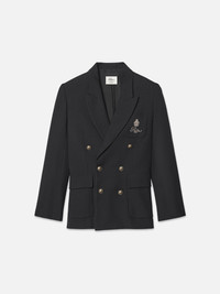 Embrace Parisian glamor in the FRAME X Ritz Paris Women's Club Blazer—a sleek, double-breasted jacket that evokes luxurious, old-school appeal. It's finished with brass buttons and gold embroidery with the famed hotelier's logo and crest. Each piece from the FRAME x Ritz Paris collaboration is crafted from luxe materials and designed to evoke the opulence and comfort of staying inside the world's most luxurious hotels. Materials & Care Dry Clean Only 68% Polyester/29% Viscose/3% Elastane 29.25" Long From Shoulder RW23WBZ002-BLK