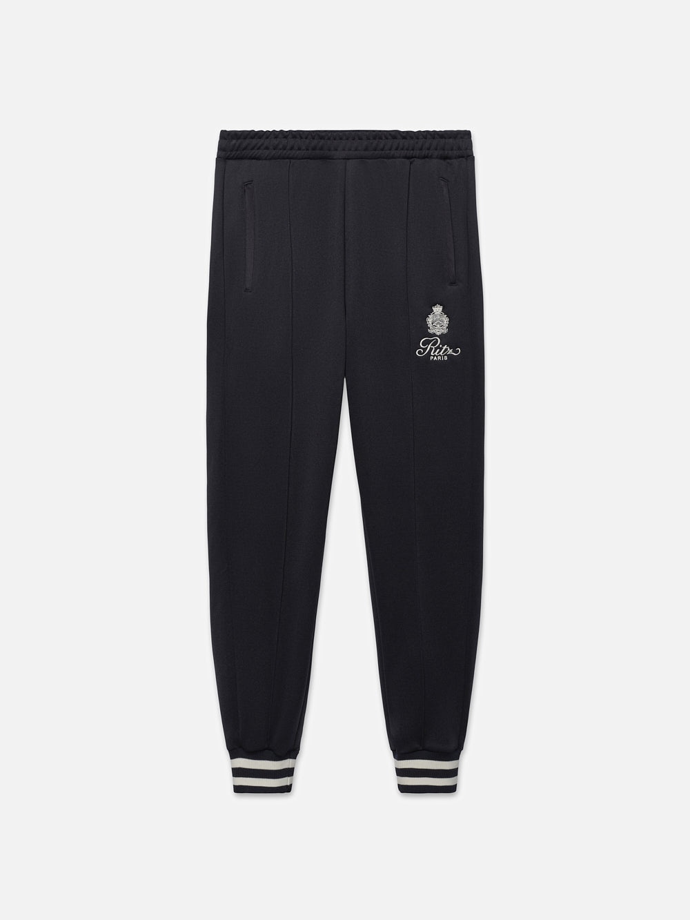 Paired with the matching jacket, these track suit pants are leisure essentials with luxury credentials. The Ritz Paris and FRAME logos are embroidered in white to contrast the classic Navy colorway, and this pant features a tapered leg fit finished with smart striped cuffs. Each piece from the FRAME x Ritz Paris collaboration is crafted from luxe materials and designed to evoke the opulence and comfort of staying inside the world's most luxurious hotels. Materials & Care 55% Polyester/45% Cotton Machine Wash 10.5" Front Rise/27" Inseam/5.625" Leg Opening LWKB0337-NAVY