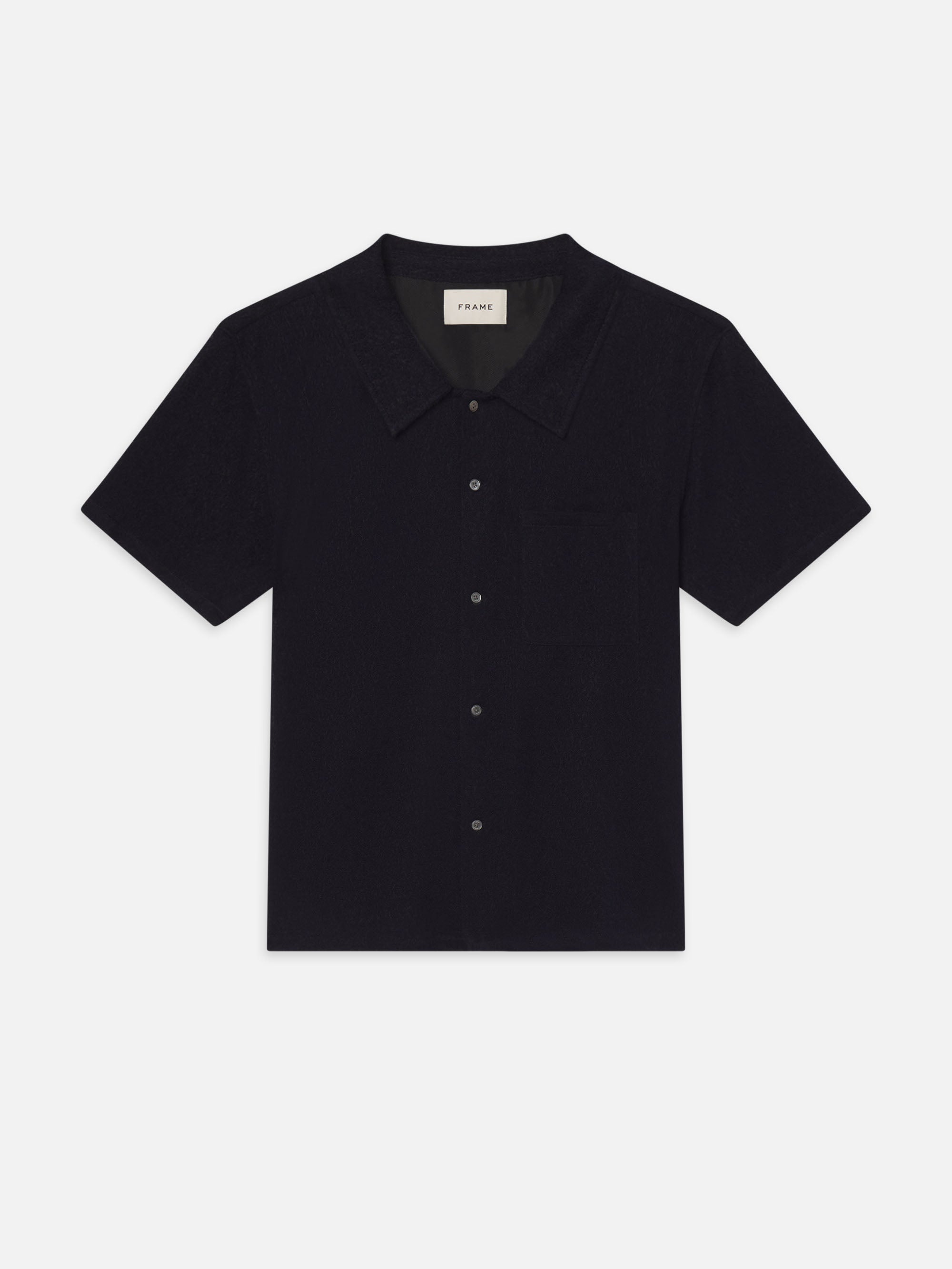 Crafted from wool terry, this shirt has a luxe, breathable design balanced by short sleeves and a straight-falling cut. This shirt has a classic appeal with standout texture, further defined by buttons and a patch pocket at the chest. Materials & Care Dry Clean Only 86% Wool/14% Nylon 27.25" Long From Shoulder MS25WSH009-DKNV