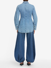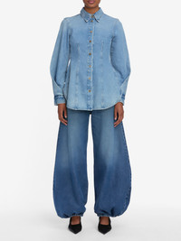 The essence of modern femininity. This structured, form-fitting shirt is crafted from non-stretch denim with figure-flattering front pleats and a nipped waist. Finished with bronze buttons and edgy twisted sleeves. A creation from Atelier, our innovative, limited release collection—where the possibilities of denim are endless. Materials & Care Dry Clean Only 100% Cotton 31" Long From Shoulder/45" Hem Width 7033868-PHOB
