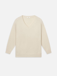 A favorite of the FRAME team. This effortlessly chic cashmere sweater has a slightly oversized fit, lightweight feel, and easy V-neck. Materials & Care Dry Clean Only 100% Cashmere 26.25" Long From Shoulder WF25KSW054-CREA