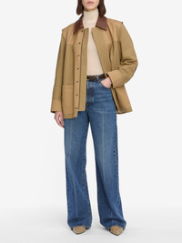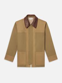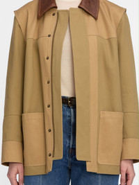 FRAME’s modern take on the classic barn jacket. Crafted in structured cotton with tonal leather trim at the collar and elbow patches. Finished with a covered placket and a longer, hip-grazing length for effortless layering. Materials & Care Dry Clean Only Self/Combo: 100% Cotton 29.5" Long From Shoulder WF25WJA009-KHAK