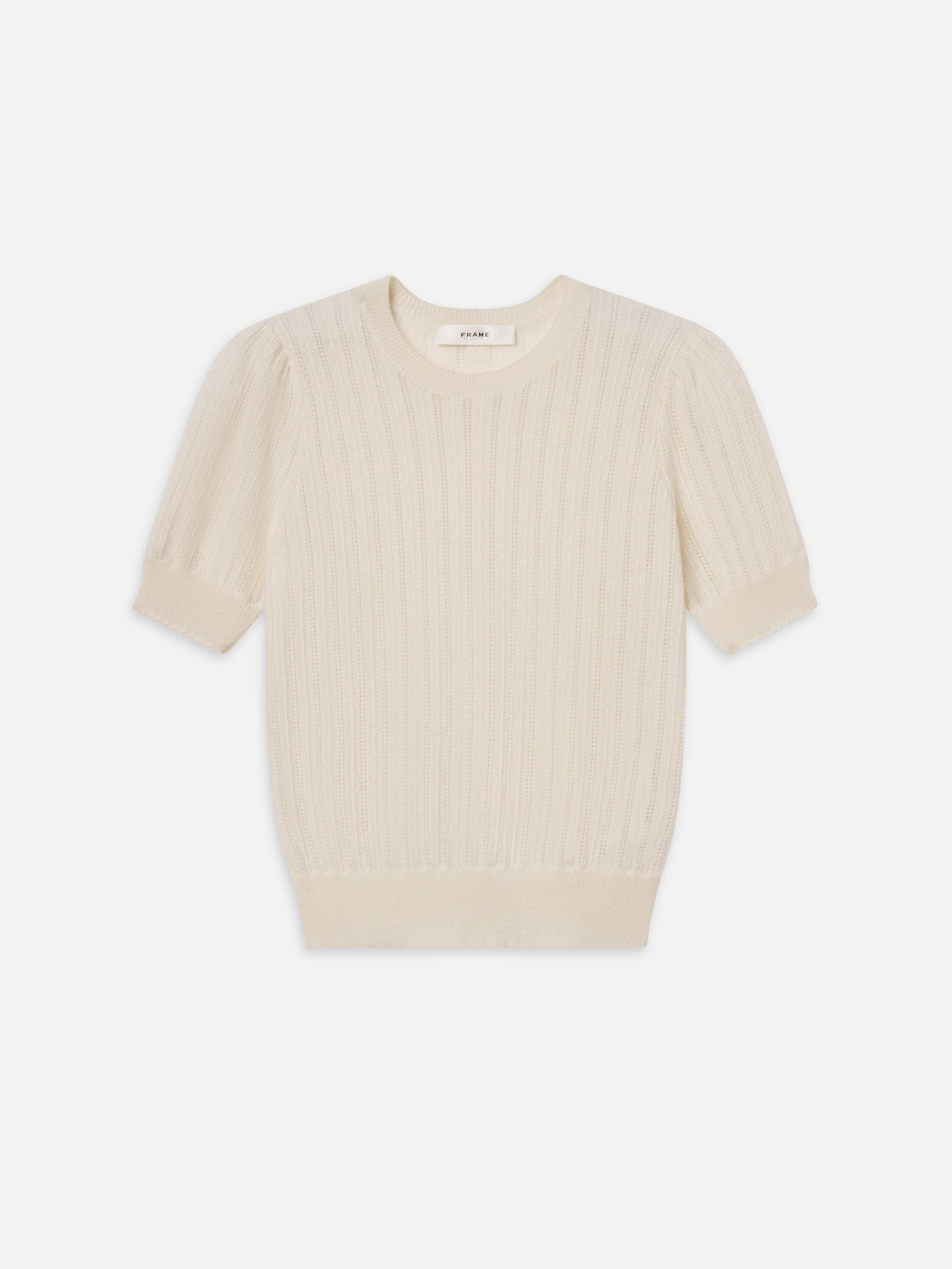 A lightweight cashmere knit with airy ladder pointelle stitching. With softly scalloped edges for an effortless, feminine feel. Materials & Care Dry Clean Only 100% Cashmere 19.5" Long From Shoulder WF25KSW039-CREA