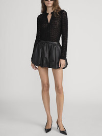 This black 100% lamb leather skirt has a chic bubble shape—filled with light tulle for volume. Mini length, with a hidden zip closure. DETAILS - Clean Professionally By A Leather And Suede Specialist - 100% Lamb Leather - 13.5" Long From Waist - WP26LSK001-BLK