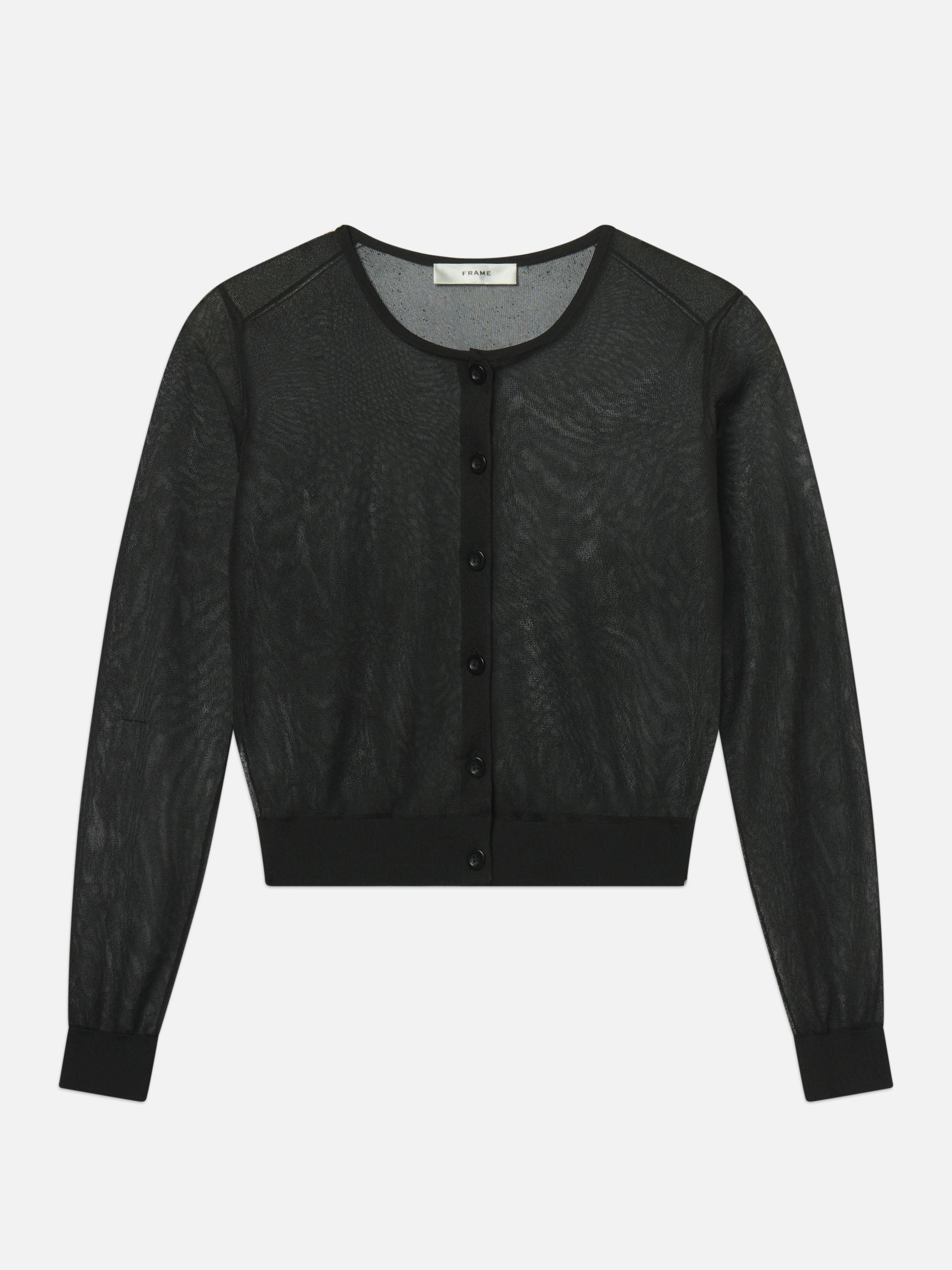 This sexy take on the traditional cardigan has a luxe, airy knit that shows off whatever's underneath. Lightweight and sheer, with an irresistible silky texture. Materials & Care Dry Clean Only 78% Viscose/22% Polyester 19.25" Long From Shoulder WF25KSW022-BLK