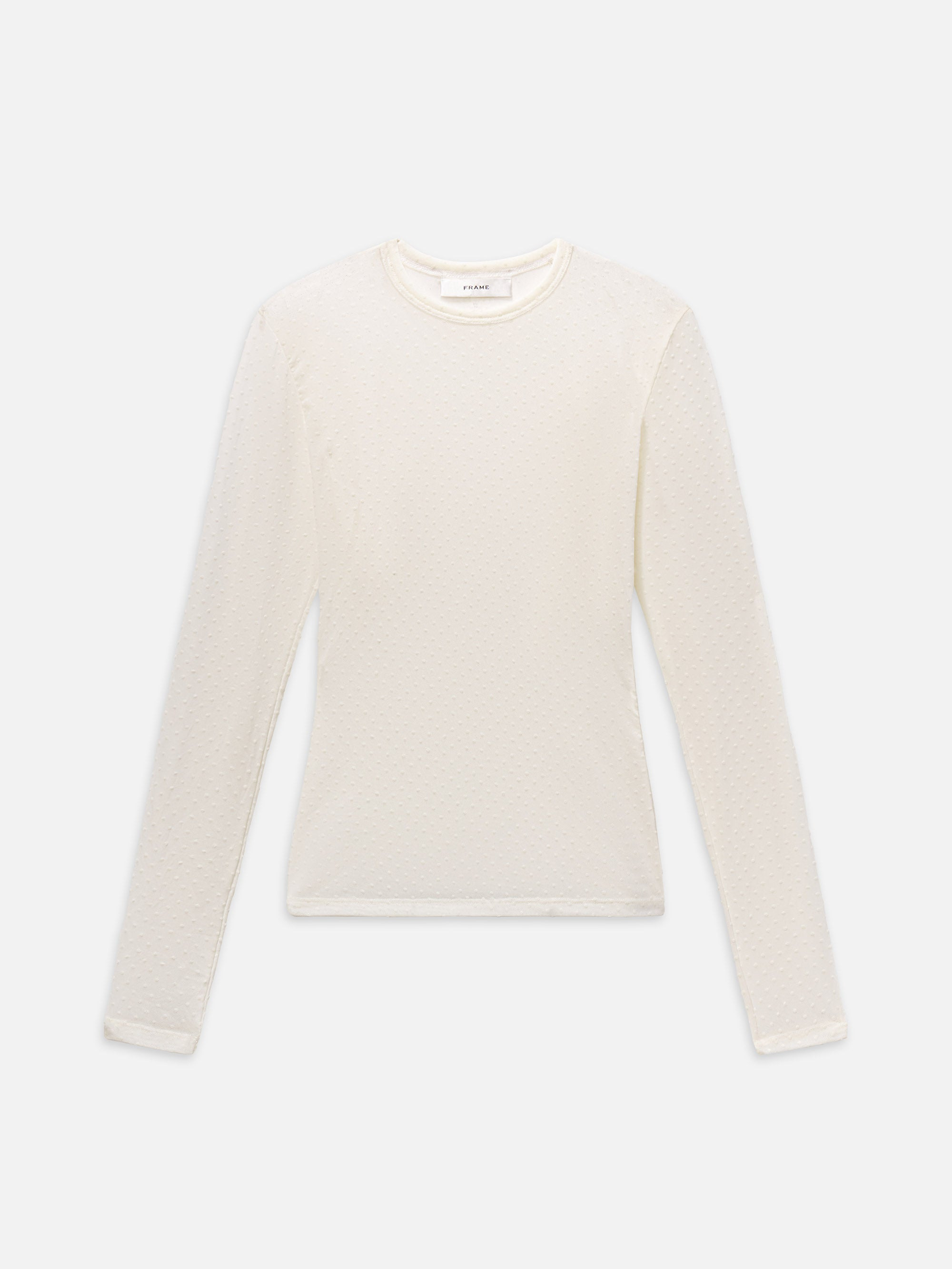 A FRAME team favorite from our latest collection, this sheer, form-fitting top features all-over matte polka dots. Polished with a playful side, The Mesh Polka Dot top makes the perfect layering piece. DETAILS - Hand Wash Cold - 94% Nylon 4% Spandex - 22.75" Long From Shoulder - WP26JTE001-CREA