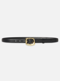 This 100% leather belt is finished with a shiny gold buckle with a modern, organic shape—refined and effortless. Materials & Care Wipe Clean. Do Not Wash 100% Cow Leather " Long From Shoulder WF25ABT008-BLK