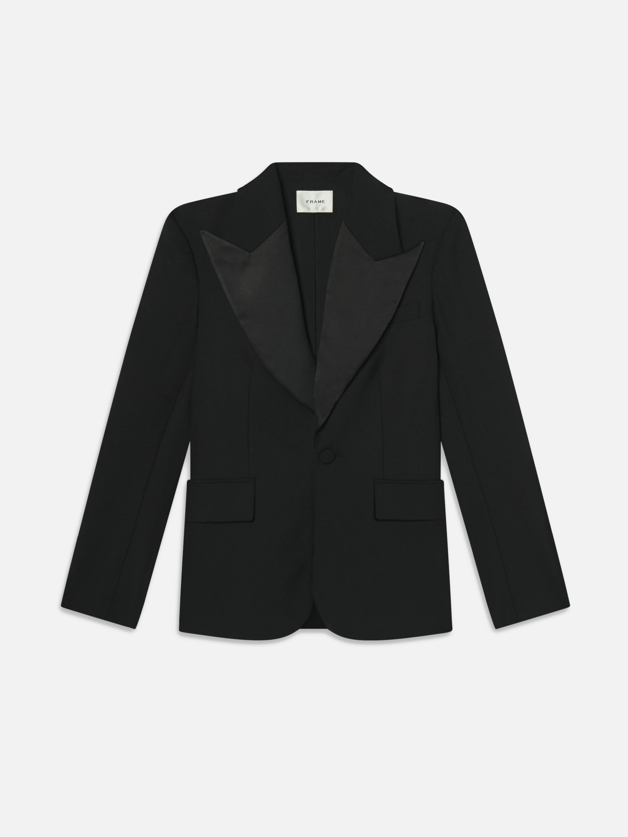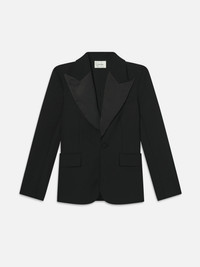 A feminine take on tailored suiting, this blazer features sleek satin contrast lapels for a dressed up, elevated accent. Tailored with a peak lapel silhouette that's easy to dress up or down. Pair it with The Cuffed Pleated trouser for a modern suit. Materials & Care Dry Clean Only 53% Polyester/43% Virgin Wool/4% Elastane 28.5" Long From Shoulder WF25WBZ001-BLK