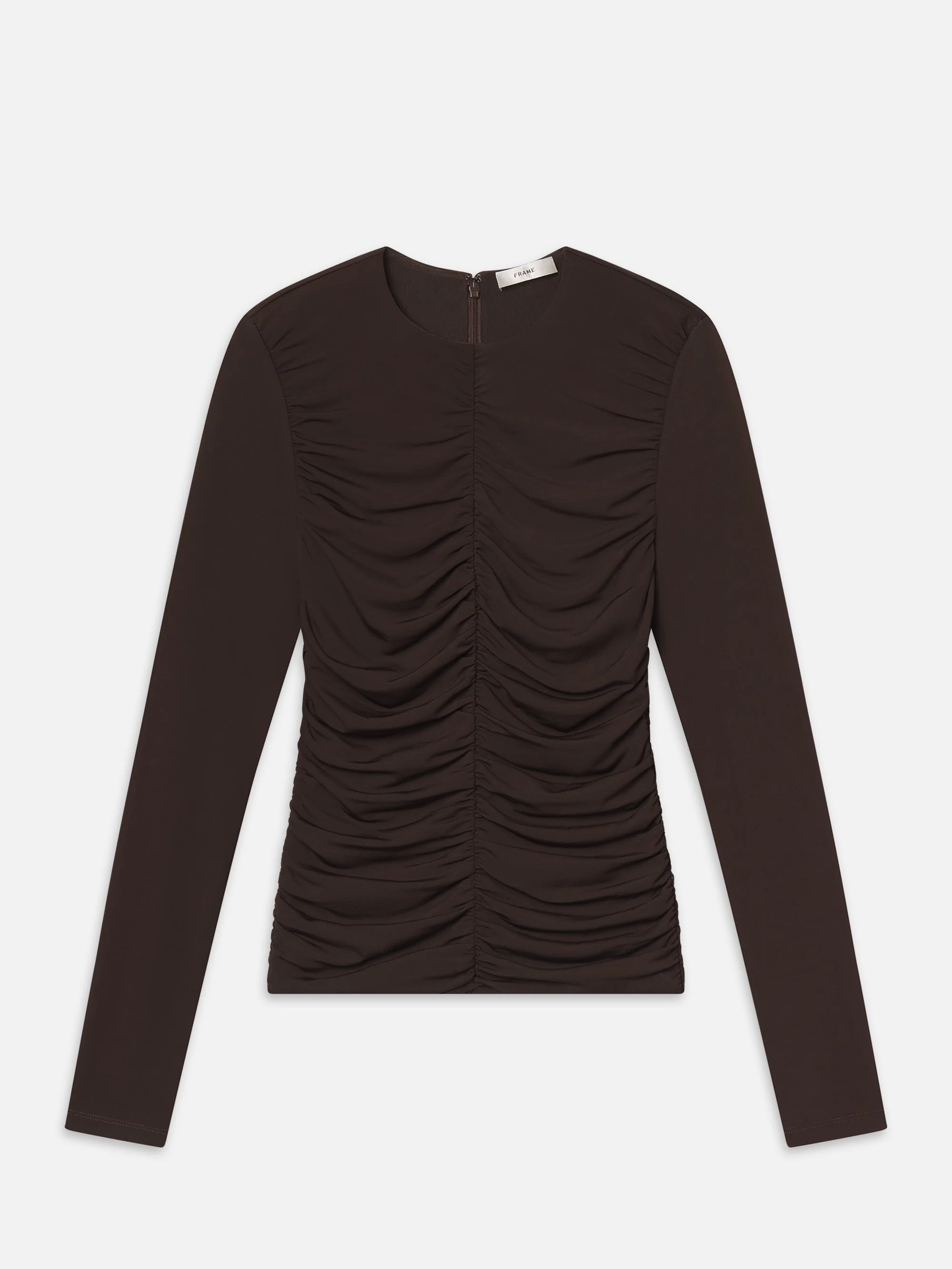 The Ruched Top is crafted from a soft stretch-viscose jersey, featuring allover ruching and a clean pullover silhouette with a discreet zipper at the back neckline. DETAILS - Dry Clean Only - 95% Viscose/5% Spandex - 21.25" Long From Shoulder - WS26JKT017-MCH