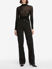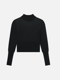This lightweight knit features a wide turtleneck, loose blouson top, and snug bottom band for the ultimate feminine shape. A sheer top contrasts the turtleneck for a look that's unexpected and subtly sexy. Materials & Care Dry Clean Only 44% Cotton/37% Viscose/18% Nylon/1% Spandex 19.75" Long From Shoulder WF25KSW006-BLK