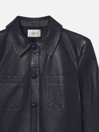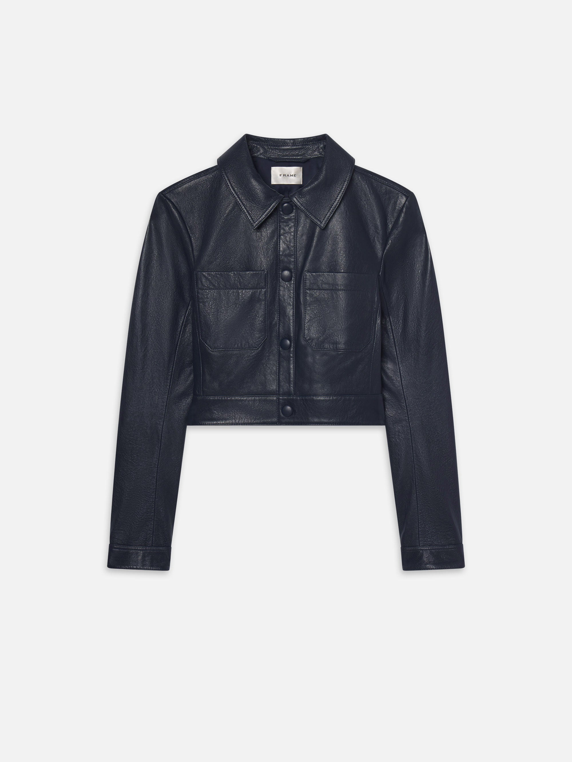 Our best-selling jacket, now in Dark Indigo for the season. The Button Front Jacket keeps it clean and simple. Crafted from lustrous lamb leather, this cropped, boxy style features leather-covered buttons and tonal patch pockets, finished with a waxy sheen that catches the light. Materials & Care Clean Professionally By A Leather And Suede Specialist 100% Lamb Leather 19" Long From Shoulder WE25LJA005-DKIN
