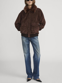 Crafted from supple 100% calf suede, The Suede Oversized Jacket features a removable shearling collar, front pockets, and ribbed trims. DETAILS - Clean Professionally By A Leather And Suede Specialist - 100% Calf Leather - 28" Long From Shoulder - WP26LJA013-AMER
