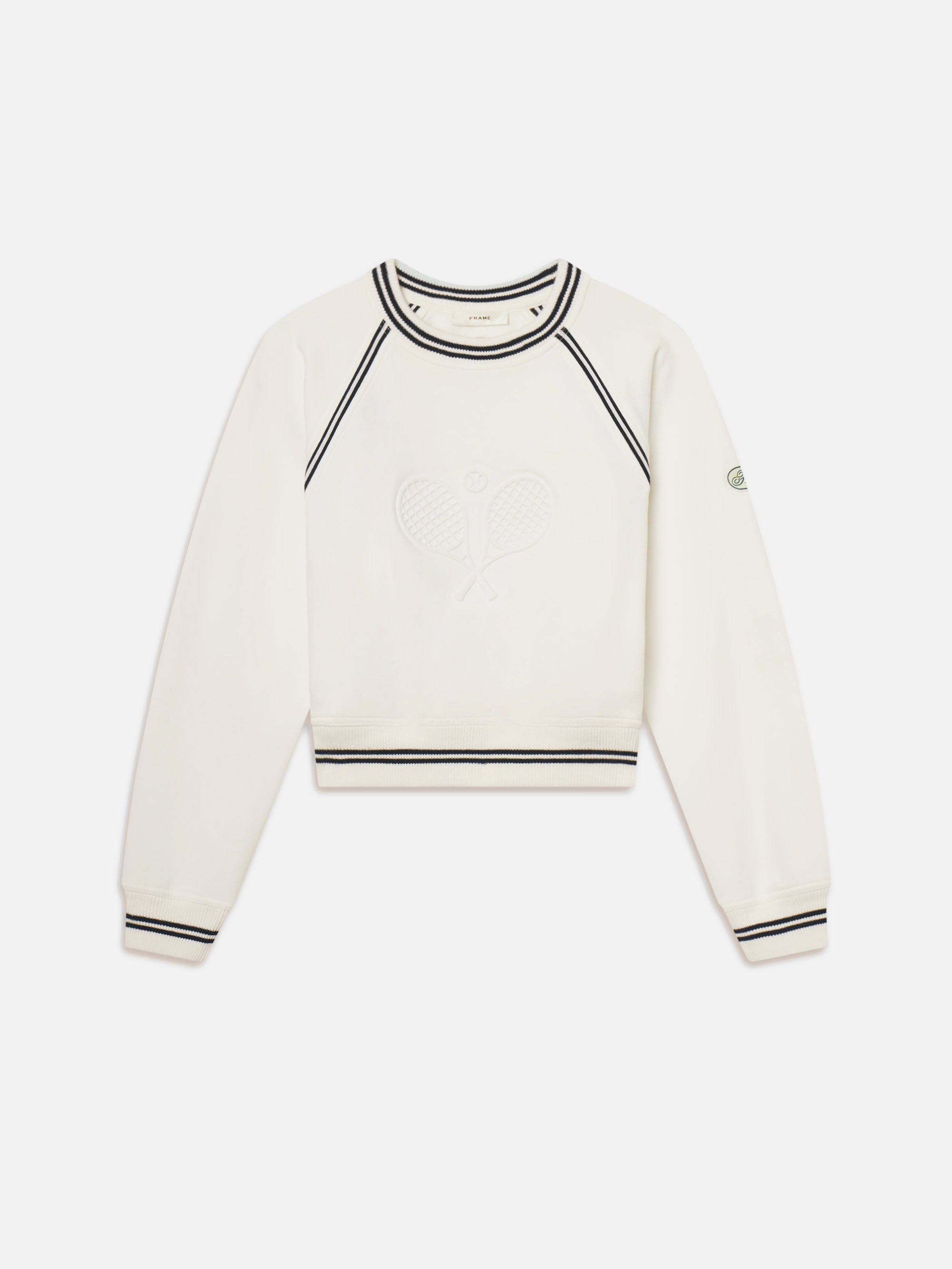 This lightweight tennis-inspired sweatshirt features our FRAME logo patch and monochromatic tennis rackets on the body. With relaxed, dropped armholes for a clean yet laid-back look. Minimal, and quietly playful—best worn with The Tennis Sweatpant. Materials & Care Machine Wash Cold 80% Cotton/20% Polyester 20" Long From Shoulder WF25JSS004-WHT