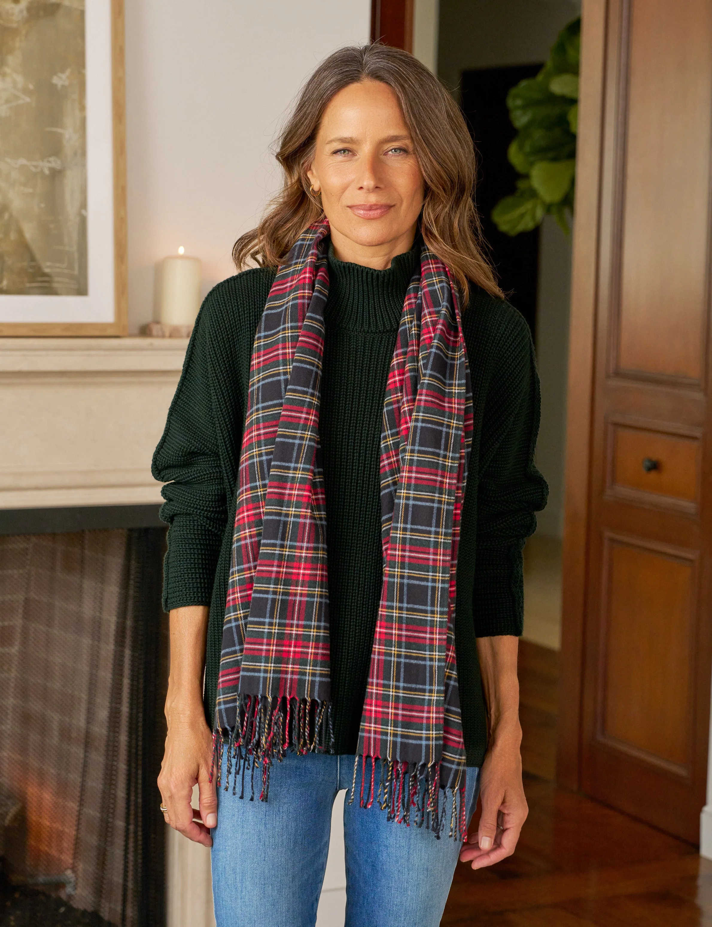 Noelle wraps all the warm and cozy feelings of the holidays into one luxuriously soft scarf. Drape this elegant piece over your favorite top layers for a final, festive touch. - Fringe trim - Length: 60" and width: 27" - Style Code: SCARF01-GBRW FABRIC + CARE - Our flannels are brushed for a buttery-soft handfeel. Like all artisanal products, no two F&E flannels are quite the same. - 100% Cotton. Cotton is sourced from the U.S., spun and dyed in Egypt, woven into fabric in Italy, then cut, sewn, and finished in Mexico. - Learn more in our Fabric Guide.
