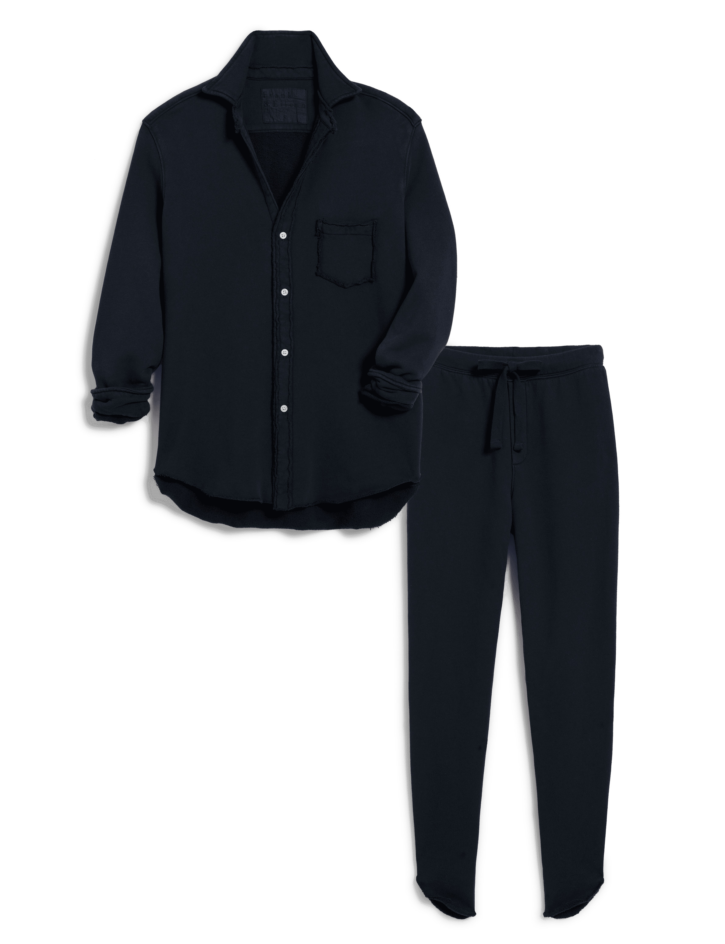 Get dressed in a New York minute in Christine and Eileen. This streamlined set is pulled together enough for brunch at Balthazar and drinks in the West Village but comfy enough to stroll through Central Park and catch the latest exhibit at The Met. - Eileen features a hand-cut raw shirttail hem, chest pocket, signature bust flattering button placement, and long sleeves with button cuffs - High-rise Christine features a cropped hand-cut raw hem, elastic waistband with trouser details, and tulip ankle - Paloma is 5'9" wearing a size S - Christine Sweatpant - Inseam: 26.5”, front rise: 10.5", leg opening: 10" (size S) - This style was made using a small batch garment-dye process, giving each piece a unique look that will evolve and fade over time - Exchange/Return Policy: Travel Sets must be returned or exchanged with both pieces together. As our garments are hand dyed in small batches, we cut both pieces from the same fabric production to ensure there aren’t any color variations. For this reason, we require the top and bottom pieces to be returned or exchanged together. - Style Code: LABSET19-BRNV FABRIC + CARE - A soft, lightly combed three-yarn knit that looks luxurious—yet feels just like your favorite sweatshirt. - 100% Cotton. Cotton comes from the U.S. and Brazil, is spun in the U.S. and Korea, finished in the U.S. - We recommend washing separately in cold water before the first wear to prevent any color transfer. After that, machine wash cold with like colors and tumble dry low. - Learn more in our Fabric Guide.