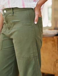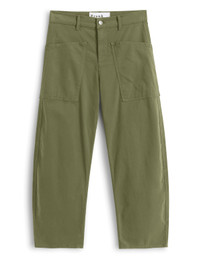 Bray is the ultimate everyday barrel pant, dialed up in smooth, elevated Italian Peached Twill. Expect a flattering barrel-style leg and cropped fit, with our signature joey pocket that wraps around your leg for a perfectly polished finish. - Finished hem - Zip fly with button closure - Signature joey pockets that wrap around your leg - Contour waistband that sits just below your natural waistline - Barrel leg fit - Paloma is 5'9" wearing a size 4 - Inseam: 26.5”, front rise: 11.5" including waistband, leg opening: 16.5" (size 4) - Style Code: BRAY-OLVT FABRIC + CARE - This tactile, year-round weight is not too light, not too heavy–just right. Made exclusively for F&E, this fabric feels like a smooth, lightly textured peach. - 97% Cotton, 3% Elastane. The raw cotton comes from the U.S. and is spun into yarn in Puglia, Italy. The unprocessed, unfinished fabric is sent to our Italian partner’s mill for dyeing, finishing, and quality control. - Turn this garment inside out, machine wash cold, and tumble dry low or hang dry. - Learn more in our Fabric Guide.