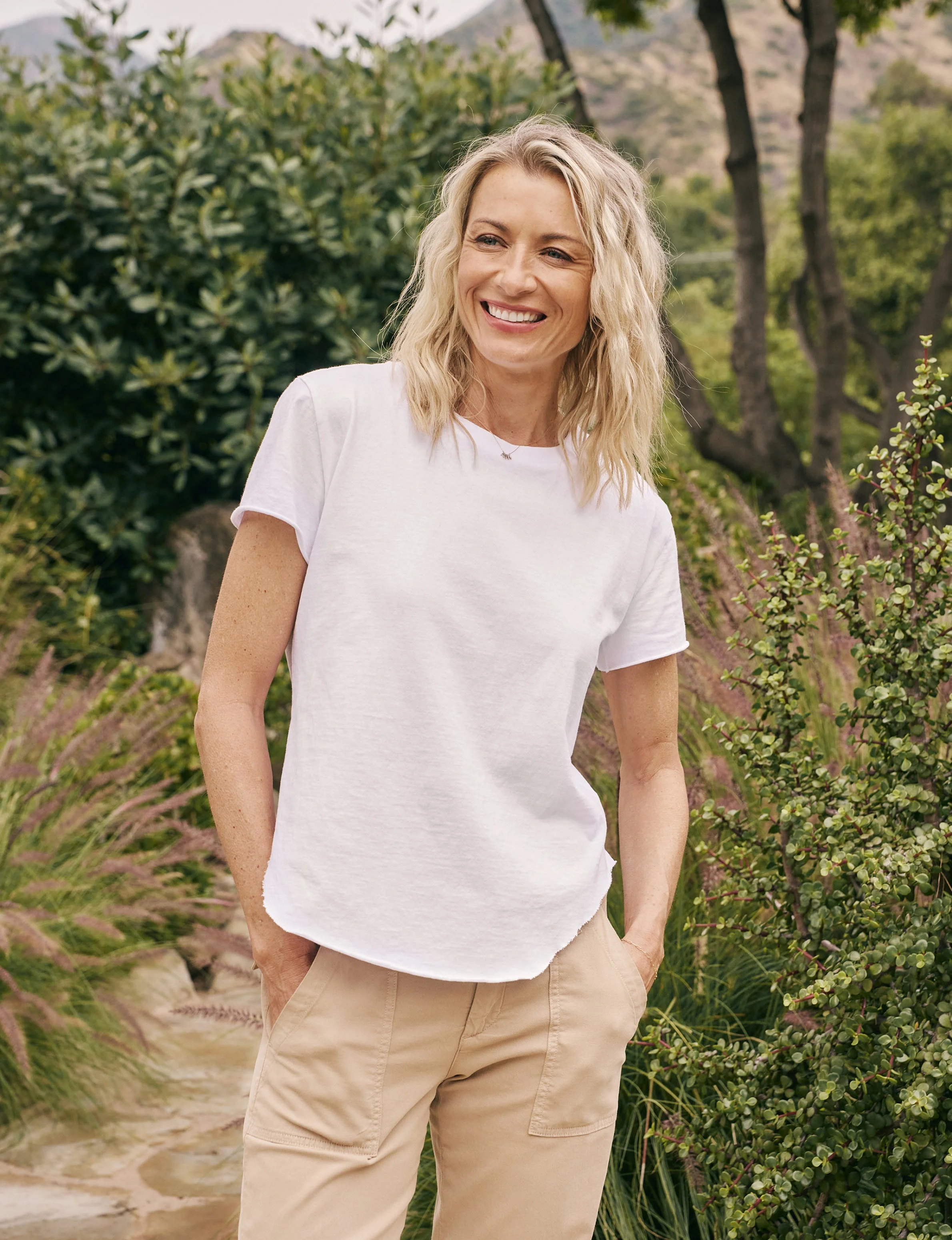 The Perfect Tee's crew neck, curved raw hem, and just-relaxed-enough fit pair perfectly with all the other staples in your closet. - Hand-cut curved raw hem that covers your bum - Ribbed crew neck - Short sleeves - Kristine is 5'9" with a 34" bust wearing a size S - This style was made using a small batch garment-dye process, giving each piece a unique look that will evolve and fade over time - Style Code: LAB219-WHT FABRIC + CARE - This durable, open-end yarn is lightweight, breathable, and feels like your favorite vintage tee. - 100% Cotton, made in the U.S. from seed to finish. Cotton is grown in the Delta region, spun into yarn in North Carolina, then knitted and crafted into garments in LA. - We recommend washing separately in cold water before the first wear to prevent any color transfer. After that, machine wash cold with like colors and tumble dry low. - Learn more in our Fabric Guide.