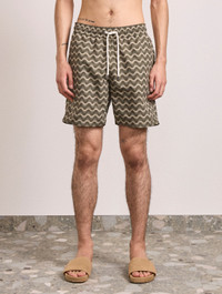 These longer-line Santos swim shorts feature our bespoke Raio do Sol print that reimagines our iconic Copacabana Wave design through rays of sun. Quick-drying and adjustable at the waist, the relaxed board silhouette makes for the ideal pool-side pair. Product Details COMPOSITION: 100% recycled polyester CARE: Machine washable at 30 degrees DETAILS: Drawstring waist Branded cord-ends Unlined Back patch pocket with flap MODEL MEASUREMENTS SKU 2610-844 MODEL WEARS SIZE M MODEL MEASURES: HEIGHT: 6'2", WAIST 29", CHEST: 33"