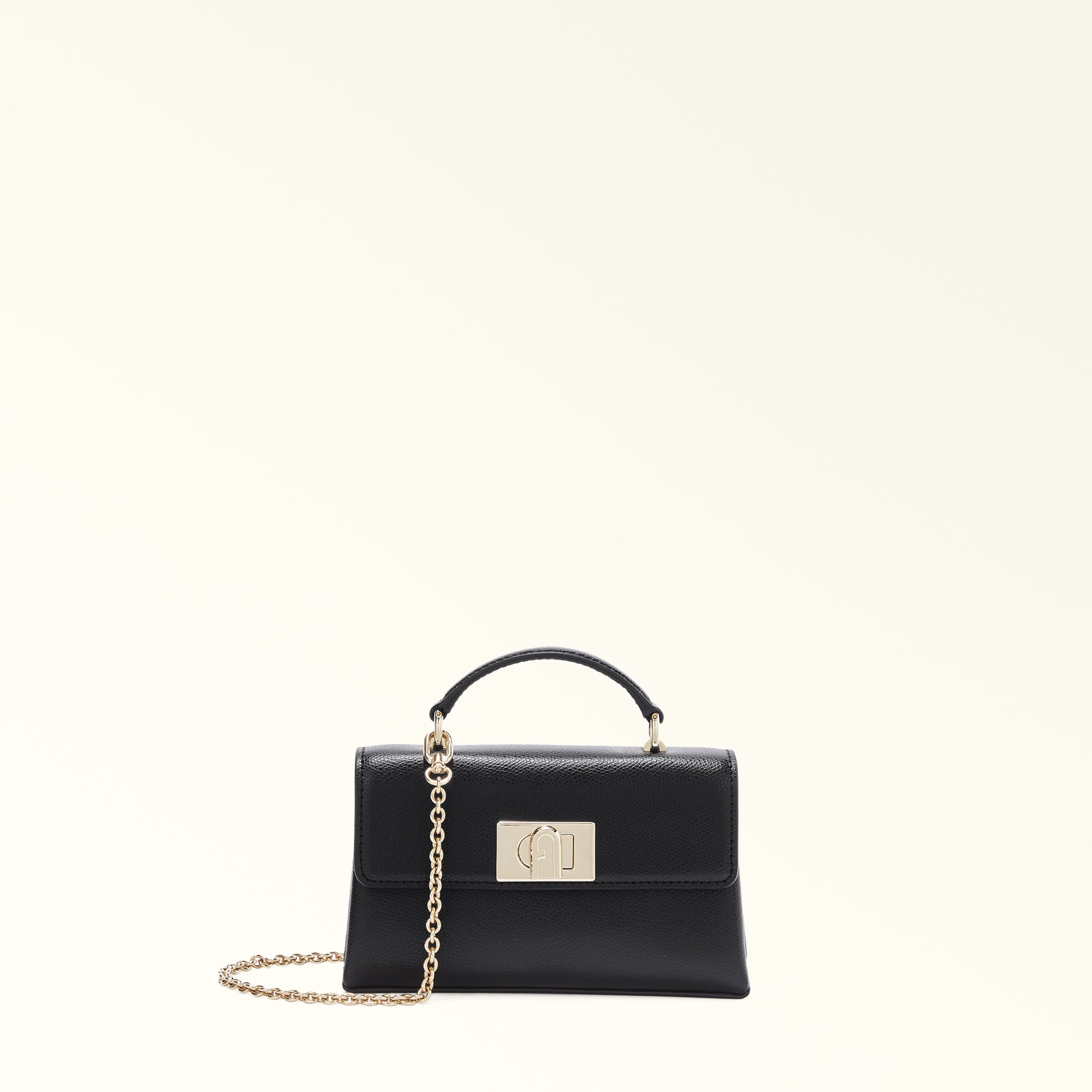 Crafted from luxurious printed leather with a grained texture, this super-cute Furla 1927 mini bag is the epitome of a good thing that comes in a small package. The timeless and elegant piece comes with a top handle and a slim detachable chain strap, allowing for versatile wear. - Three inner credit card slots - Twist closure with Arch logo Details Interior Details: 3 Cc Slots Exterior Details: Top Handle Material: Textured Leather Strap information: Removable/Non Adjustable Chain Strap Closure: 1927 Arch Turn-Lock Product Code: WE00423ARE0001007O6000 Internal Composition: 80% Polyester 20% Leather External Composition: 100% Leather Plating: Gold Dimensions in INCH 7,28 x 4,13 x 1,77 (w x h x d)