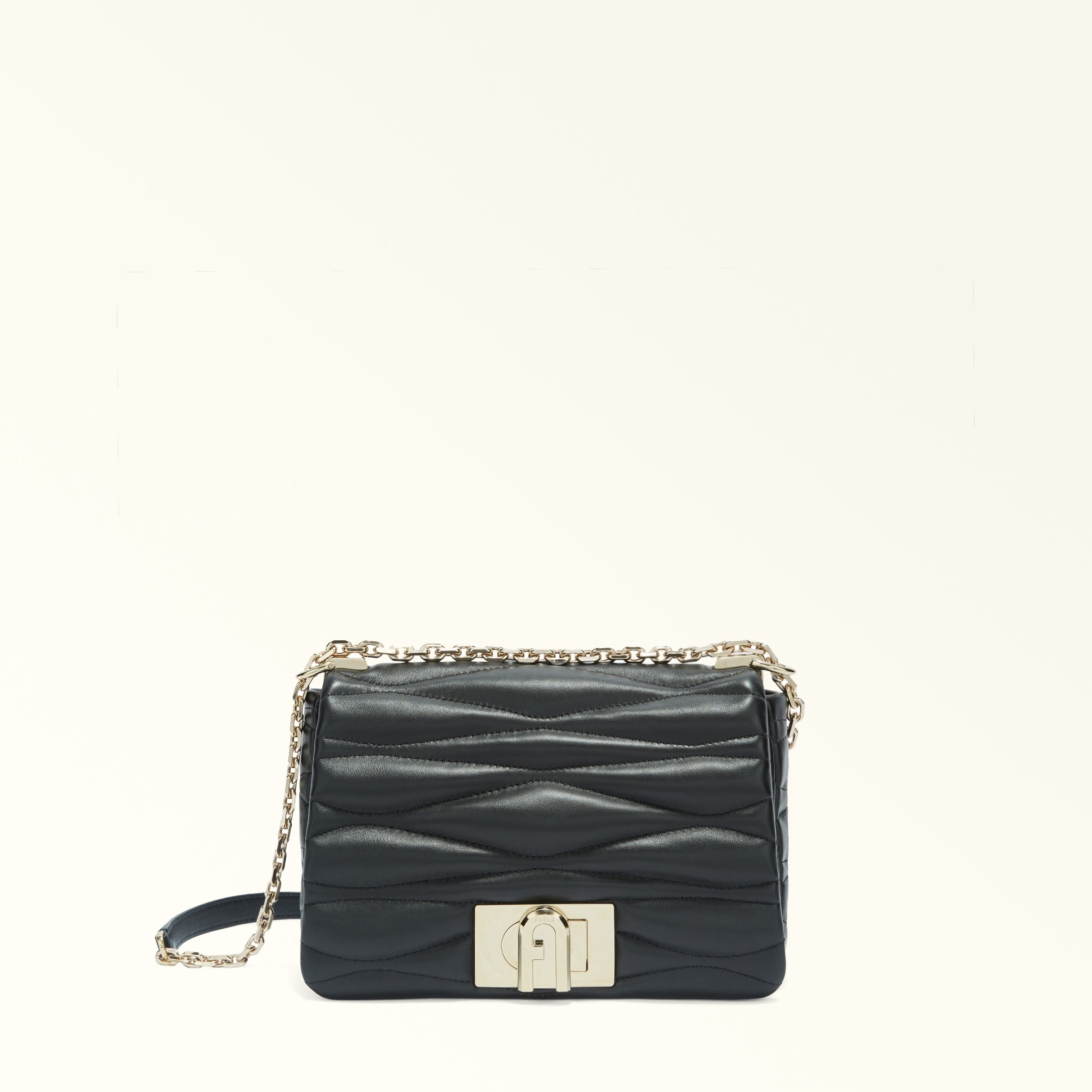 With the perfect amount of space for all your essentials, the small Furla 1927 bag can be worn on your shoulder or as a crossbody. Made of a soft and plush quilted nappa leather with a woven finish, it is equal parts elegant and contemporary. - Inside open pocket - Inside zip pocket - Adjustable chain shoulder strap with leather sections - Twist closure with Arch logo Details Interior Details: 1 Flat Open Pocket Material: Quilted Nappa Dattero Lux Calf Leather Strap information: Fixed/Adjustable Chain Strap With Leather Parts Strap Length Max: 40.55 in Strap Length Min: 40.55 in Closure: Arch Turnlock Closure Product Code: WB01671BX32211007O6000 Internal Composition: 100% Polyester External Composition: 100% Ovis Aries Leather Plating: Gold Dimensions in INCH 8,46 x 5,51 x 2,56 (w x h x d)